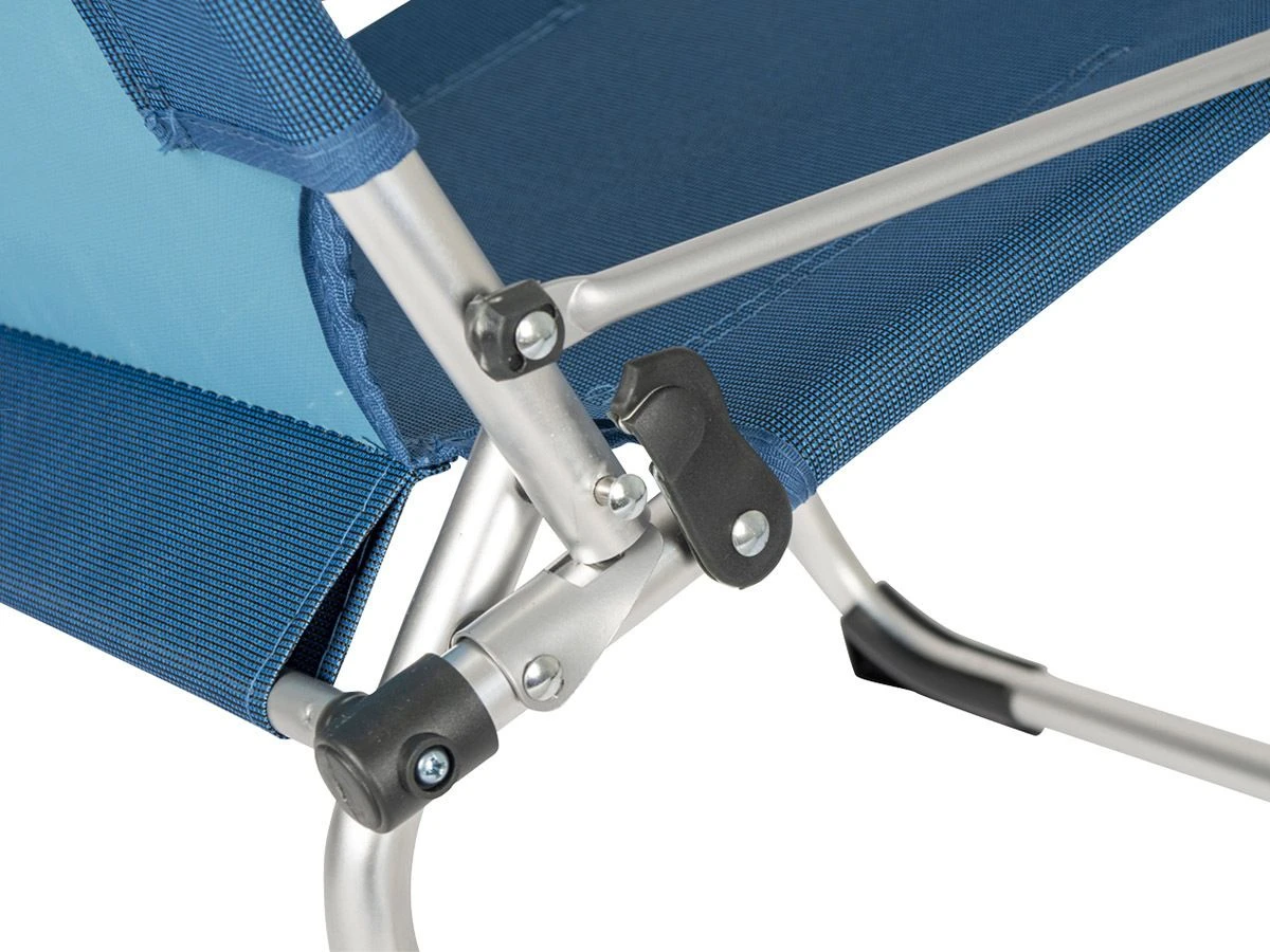 Het frame van de stoel is gemaakt van lichtgewicht aluminium en de bekleding is van een sterke polyester stof in een mooie blauwe kleur. Je kunt deze kinderstoel plat in klappen tot een dikte van maar 7 cm. De stoel neemt dus weinig ruimte in beslag wanneer je hem wilt vervoeren of opbergen.