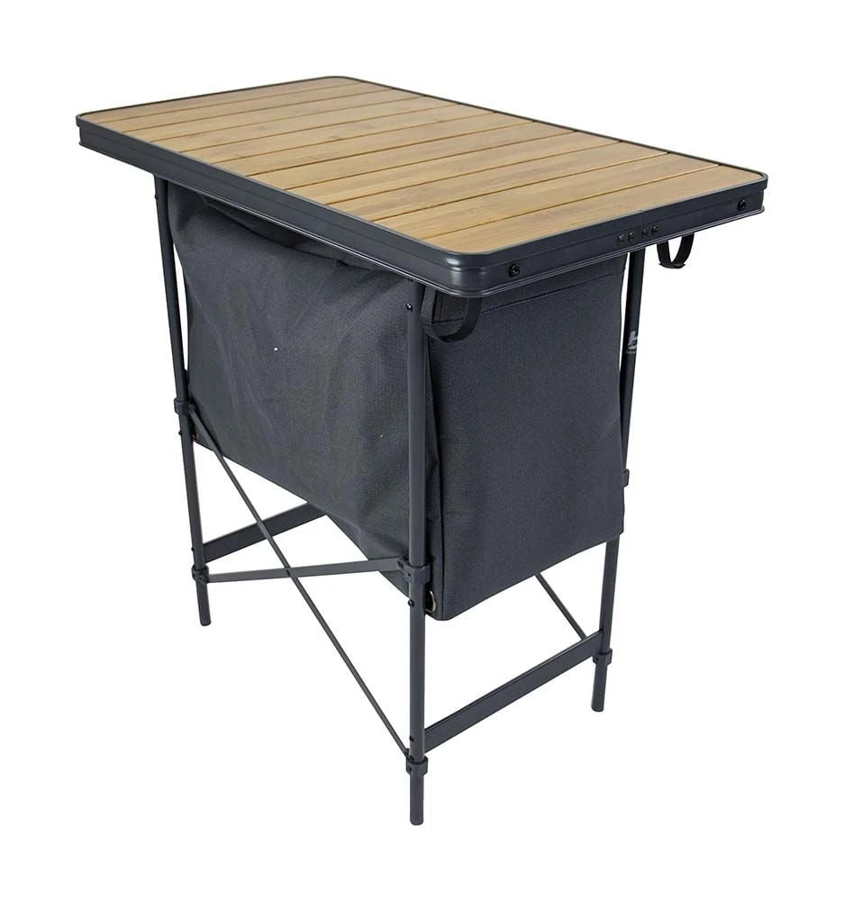 Een stijlvolle kookkast met aluminium frame. Het kookmeubel is voorzien van een bamboe blad. Verder is de kast compact opvouwbaar in de bijgeleverde draagtas door de poten naar elkaar toe te schuiven en neer te liggen onder het blad. De kast bestaat uit 1 vak waar een stevige inlegplak in ligt. Ook is het tafelblad hittebestendig en watervast.