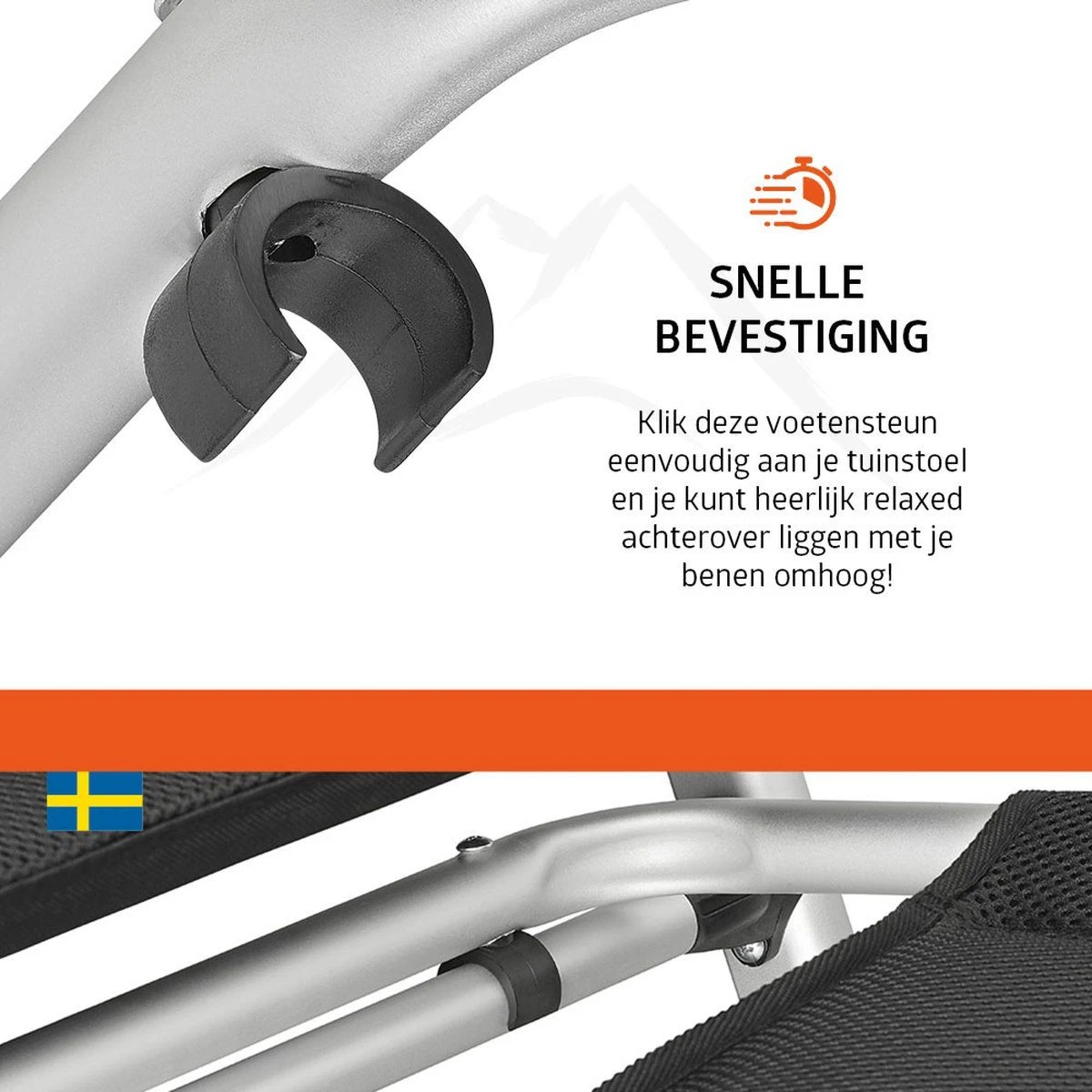 De voetensteun past tevens op de meeste gangbare camping- en tuinstoelen, zolang ze maar een extra stang onder de zitting hebben, waarop de voetensteun geklikt kan worden.