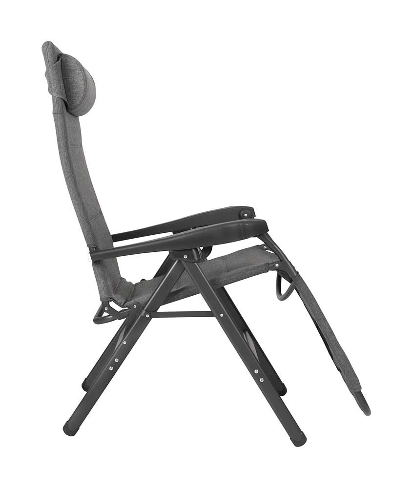 Een zeer luxe en één van de meest comfortabele relaxstoelen. Deze traploos verstelbare relaxstoel is voorzien van een extra dikke en stevige Tex Supreme stof. Deze gepolsterde stof loopt volledig om het frame heen, waar de luxe stof aan de achterkant wordt bevestigd en een zeer aangename zit is gecreëerd. Daarnaast lopen de elastieken volledig over de rug voor een verhoogde mate van comfort en zorgt de afwerking voor een stijlvolle uitstraling. Bovendien is de stof zeer onderhoudsvriendelijk, waterafstotend en extra bestand tegen verkleuring door de zon. Zowel de rugleuning als de armleggers van deze relaxstoel zijn ergonomisch gevormd en de stoel is voorzien van een remsysteem om de stoel in iedere gewenste positie te fixeren. De stoel is voorzien van een geanodiseerd H-frame voor extra stabiliteit en stevigheid. Ingeklapt is deze stoel zeer compact en daardoor gemakkelijk mee te nemen in de meegeleverde opbergtas.