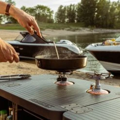 Je zet de Fjordsen Freyja Outdoor keuken in één minuut op. Je zet de opbergbox op het onderstel, klapt het keukenblad uit, haalt de gasbranders uit de opbergbox en plaatst deze in de daarvoor bestemde vakken. Zo kook je altijd en overal jouw favoriete maaltijd. En ben je klaar met koken? Dan berg je de keuken binnen één minuut weer op.
