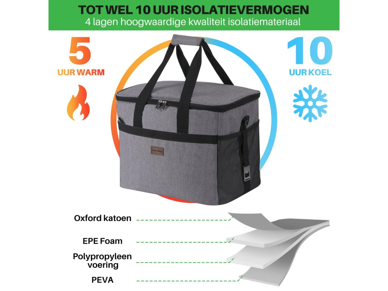 KWALITEIT: De buitenkant van de tas is gemaakt van waterafstotend materiaal met een hoge dichtheid. Het koelvak van de tas is gemaakt van dikke laag hoogwaardig PEVA-folie. Hierdoor kan je de tas makkelijk schoonmaken en blijft de inhoud tot wel 10 uur koel.