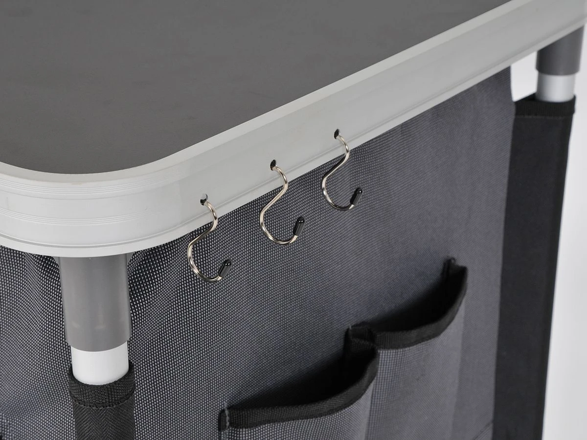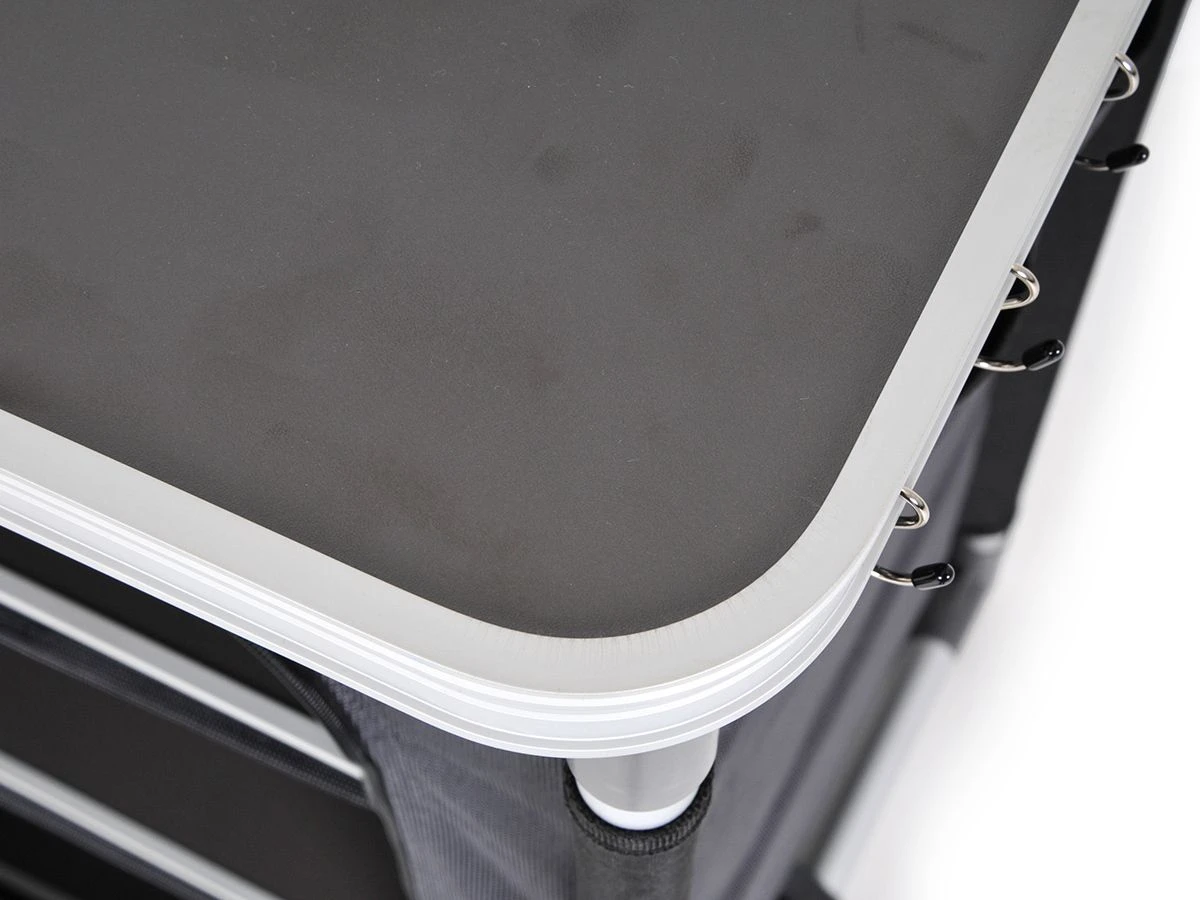 De Dublin Luxe heeft een lichtgewicht aluminium frame met een polyester bekleding. Zowel het bovenblad als de legplanken zijn gemaakt van MDF en afgewerkt met een aluminium rand. De kast is voorzien van vier verstelbare poten zodat je de kast altijd waterpas kunt zetten op een ongelijke ondergrond. Zodra de vakantie afgelopen is kun je de kast eenvoudig uit elkaar halen en opbergen in de meegeleverde draagtas.