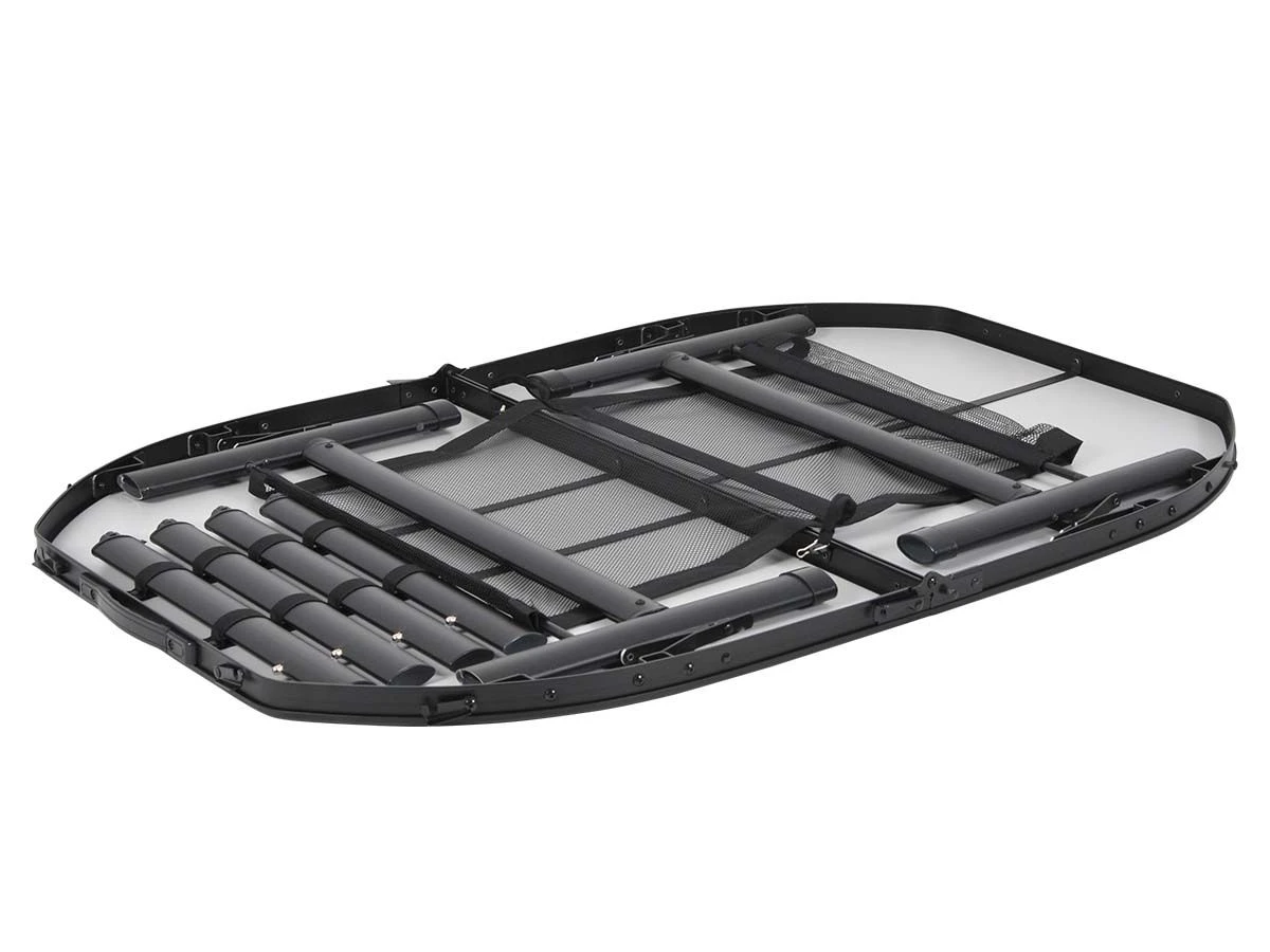Onder het blad zit een handig lectuurnet zodat je altijd je boek of tijdschrift in de buurt hebt. Na gebruik is de tafel compact op te vouwen, door het deelbare blad kun je de tafel inklappen als een koffer.