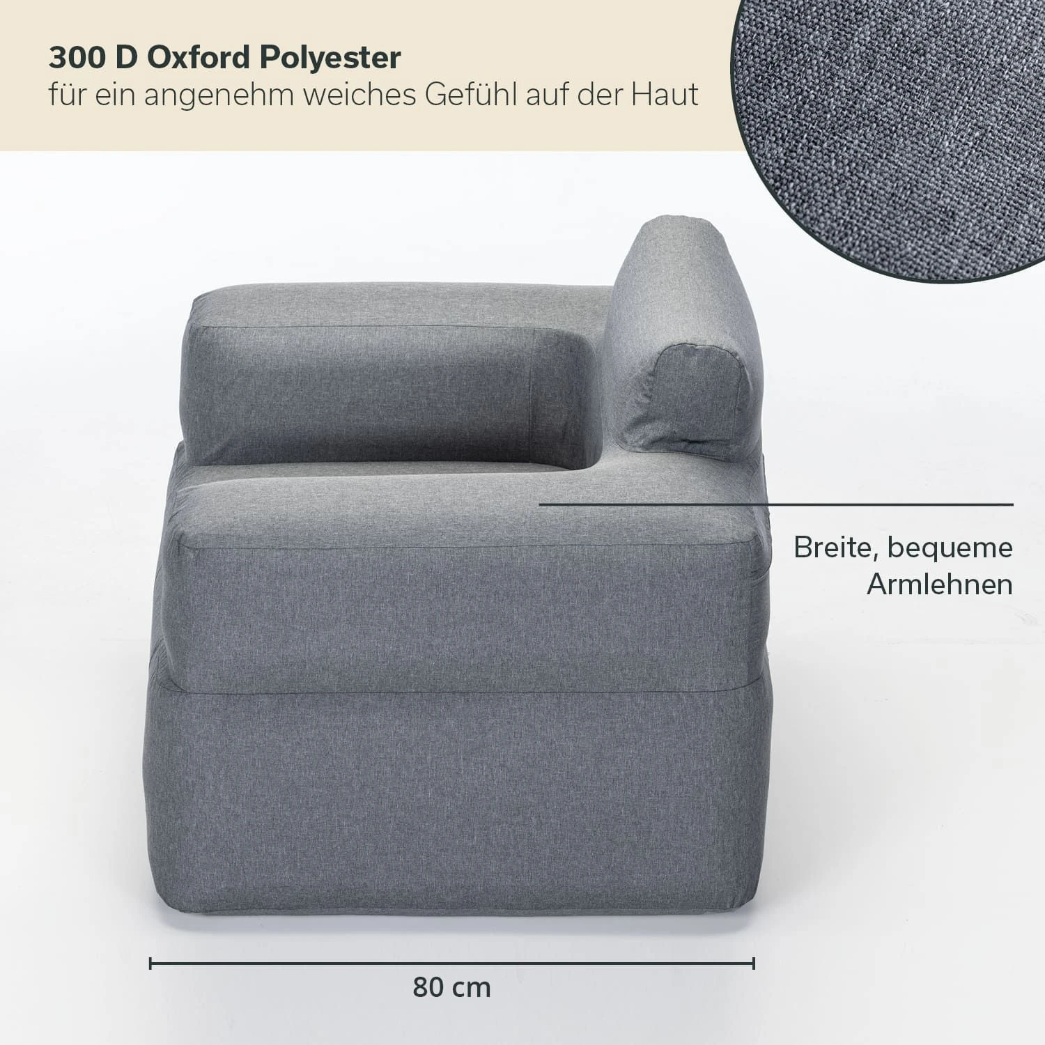 Met zijn twee afzonderlijke luchtkamers kan het vulvolume worden aangepast voor zowel de ergonomische, 39 cm hoge zitting als de brede armleuningen en hoge rugleuning. Dit biedt maximaal comfort en optimale stabiliteit. De bank heeft een belastbaar gewicht van 200 kg.
