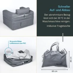 Een absoluut hoogtepunt van de luchtstoel is de krachtige elektrische pomp, die speciaal is ontwikkeld voor snel en eenvoudig oppompen en discreet is geïntegreerd in de rugleuning van de bank zodat je hem altijd bij de hand hebt. Dankzij de selectie verwisselbare ventielen kan de pomp ook worden gebruikt voor andere opblaasbare artikelen.