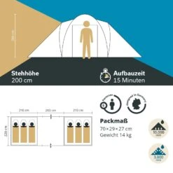 Vele extra’s, zoals een haak voor het ophangen van een campinglamp, een opbergvak en ventilatieopeningen voor een constante luchtcirculatie, zelfs als de deuren gesloten zijn, maken van de Hammerfest Protect een zeer praktische en comfortabele tent die ook snel en eenvoudig op te zetten is dankzij de kleurgecodeerde stokken.