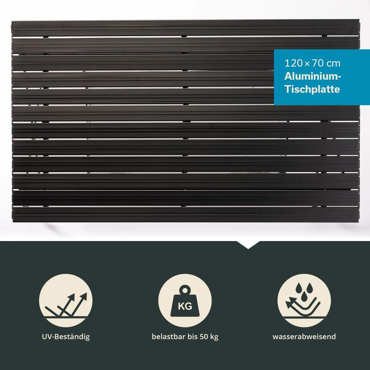 * Tafelblad: 120 x 70 cm / Hoogte: 58 – 78 cm / Gewicht: 6,1 kg / Pakmaat: 123 x 19 x 12 cm