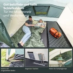 Organiseervakken in de slaapcabines houden belangrijke kleine spullen veilig en altijd bij de hand, en een praktische plafondhaak biedt een ophangmogelijkheid voor een campinglamp. En als de vakantie voorbij is, zorgt een robuuste draagtas ervoor dat deze slimme tent veilig vervoerd en netjes opgeborgen kan worden.