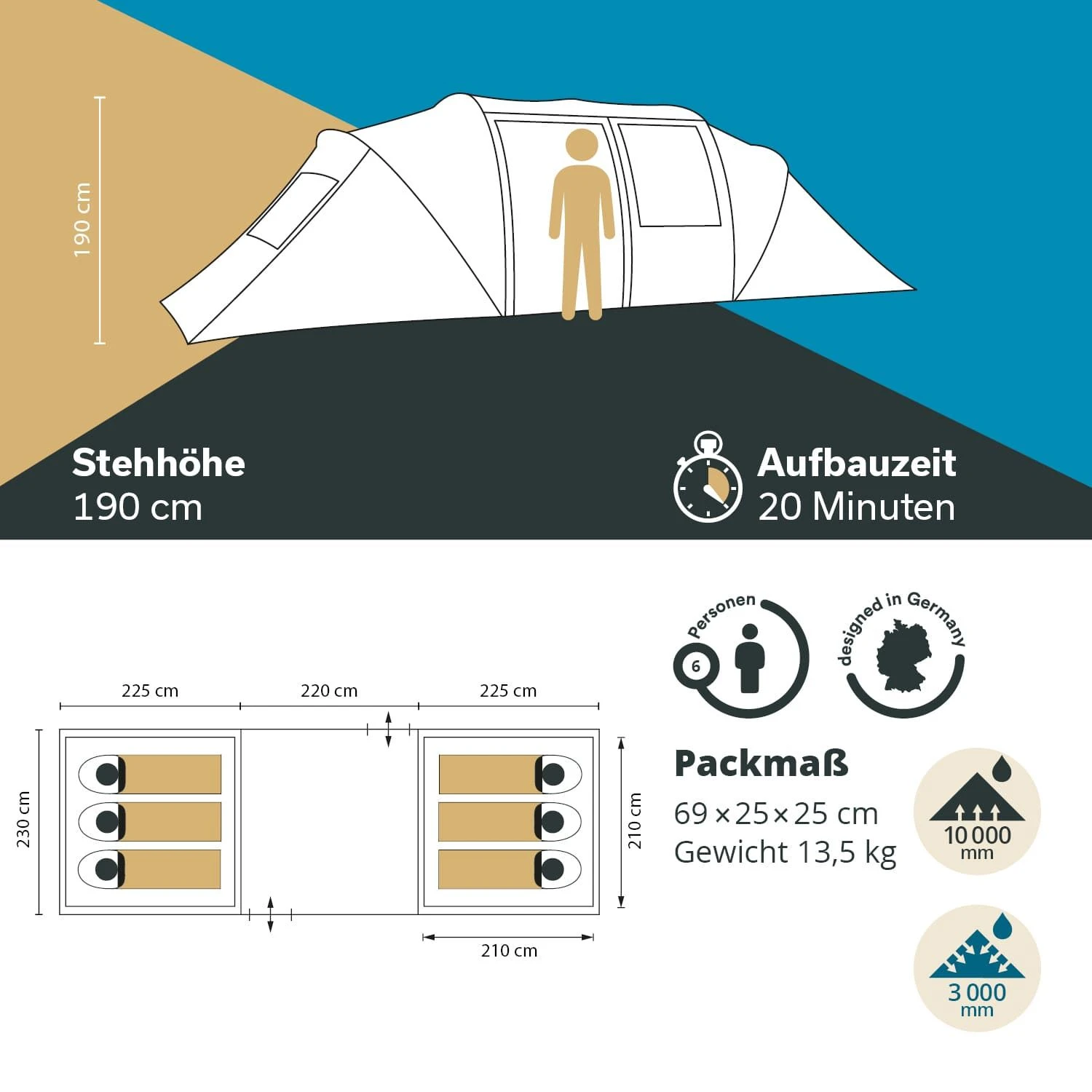 Dankzij de waterkolom van 3.000 mm en de robuuste stokken is de compacte koepeltent absoluut wind- en weerbestendig. Regen of zonneschijn, koele herfstdagen of zwoele zomernachten – de Kalmar 6 past zich perfect aan de weersomstandigheden aan en zorgt altijd voor een comfortabel verblijf.