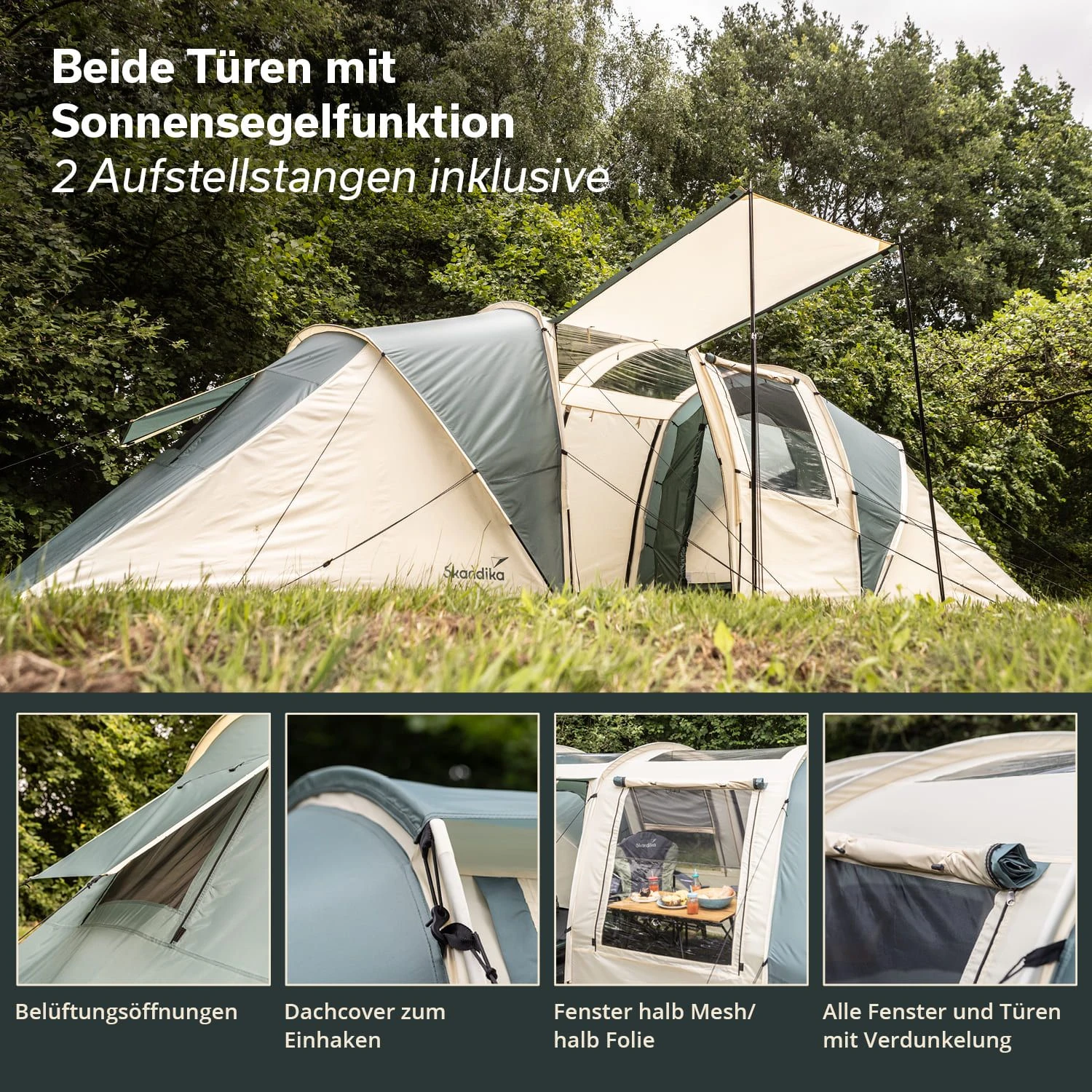 De twee ingangen aan de voor- en achterkant van de tent zijn praktisch en bieden toegang tot het leefgedeelte. Met behulp van de twee meegeleverde stokken kan een van de deuren ook worden gebruikt als schaduwgevende luifel.