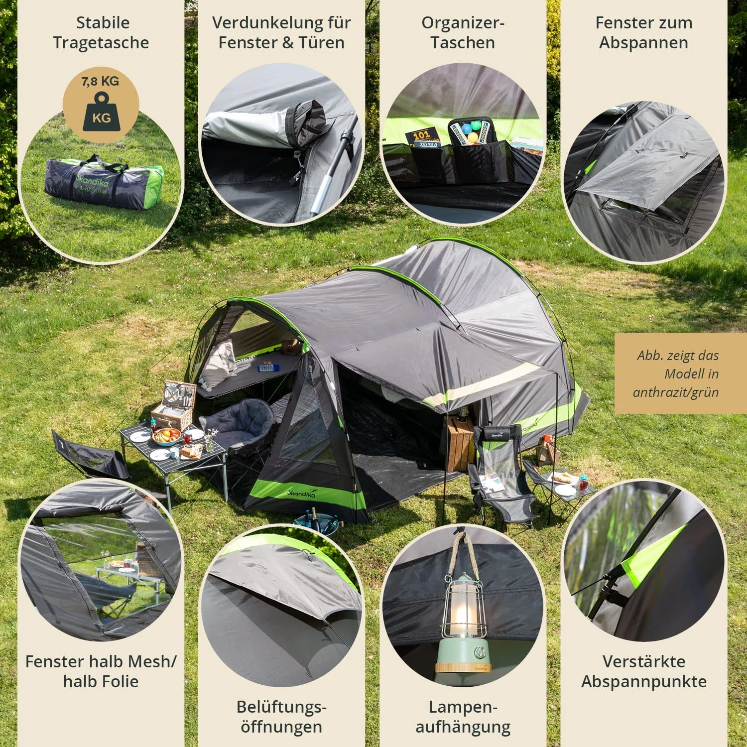 Nieuw is de zilverkleurige coating op de buitentent in de slaapcabine. Hoewel deze coating niet in de buurt komt van het verduisterende effect van de Skandika Sleeper technologie, draagt hij toch bij aan een merkbaar verduisterend effect en zorgt zo voor een rustiger nachtrust. De vestibule is ideaal voor het creëren van een leefruimte met ruimte voor bagage en kampeermeubilair zoals een tafel en stoelen. Dit is een harmonieuze plek om samen te komen voor een maaltijd of om plannen te maken voor de volgende dag. De slaapcabine heeft een eigen vast ingenaaid grondzeil en voor het woongedeelte wordt een apart grondzeil meegeleverd. Dit geeft je veel ruimte voor een persoonlijke inrichting.
