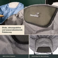 De bijzonder grote, ronde zitting van deze XL-campeerstoel is aangenaam zacht opgevuld en het slijtvaste materiaal is ook gemakkelijk schoon te maken – gewoon afnemen met een vochtige doek en de campingstoel ziet er weer fris uit.