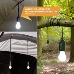 Het handige LED-lampje in gloeilamp-look werkt eenvoudig met drie AAA-batterijen en is volledig onafhankelijk van een vaste stroombron. De lamp wordt opgehangen door middel van een 100 cm lang snoer aan het bovenste uiteinde, dat op verschillende manieren kan worden bevestigd. Rechtstreeks aan een lijn geknoopt, aan een lus gebonden en aan een haak gehangen of gewoon een paar keer om een tak gewikkeld – het lange koord maakt het gemakkelijk om dit kleine lichtgevende wonder altijd en overal te gebruiken.