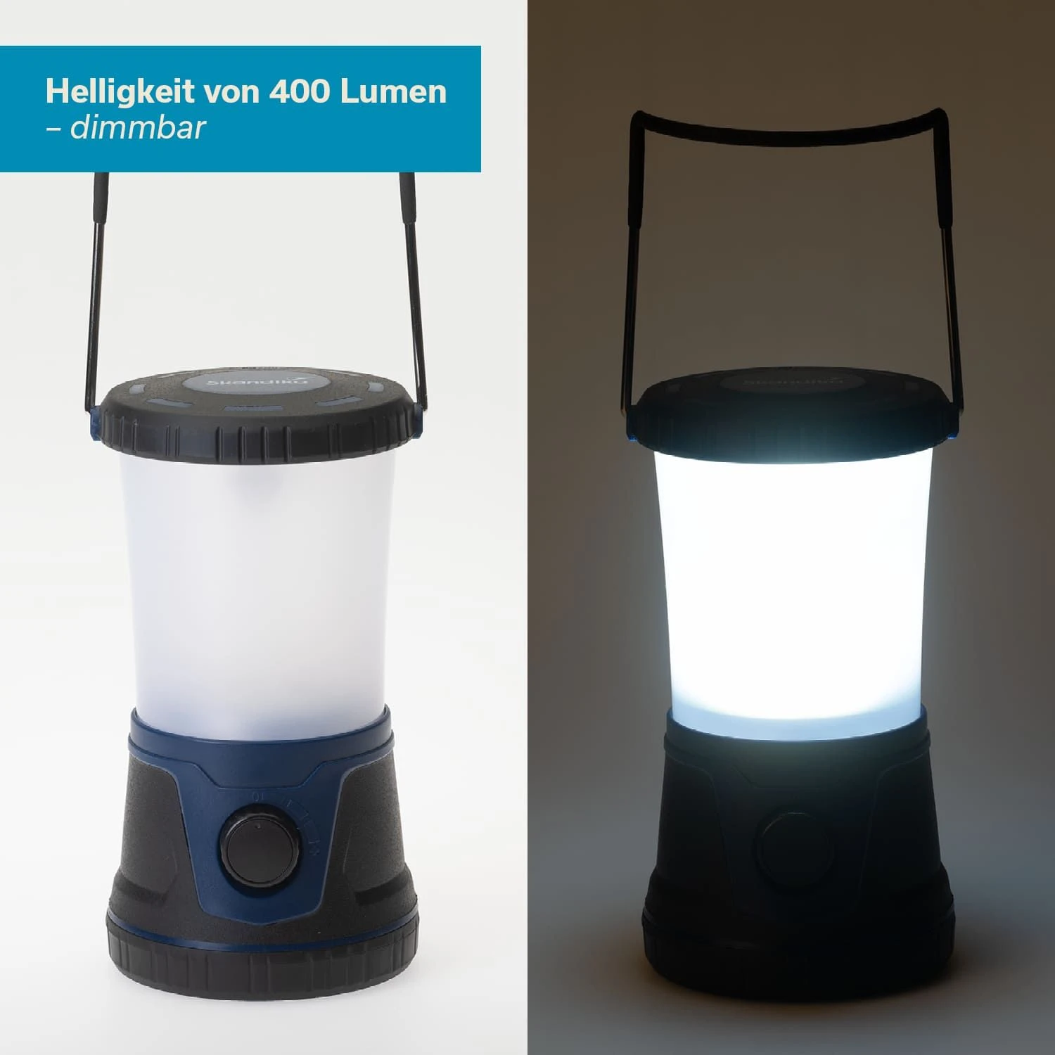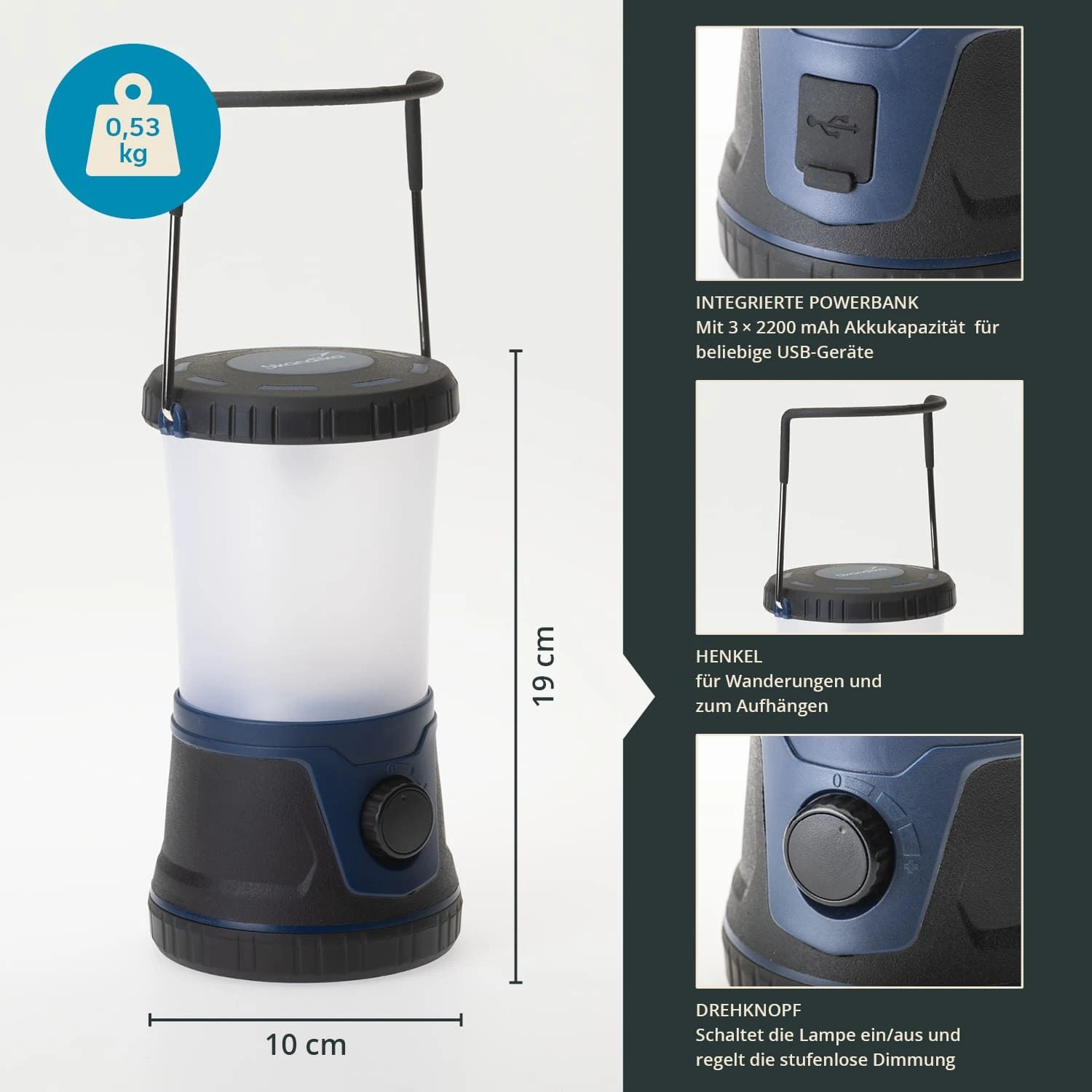 De bediening is snel en eenvoudig. De lamp wordt in- en uitgeschakeld met de draaiknop aan de voorkant. De lichtsterkte kan traploos feller worden gemaakt en gedimd met dezelfde knop – perfect als leeslampje op het terras en als nachtlampje voor de kinderen in de tent.