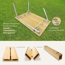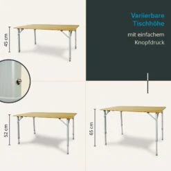 Zelfs het bamboe tafelblad van deze klaptafel kan worden ingeklapt (de 4 segmenten worden gewoon op elkaar geklapt) zodat het pakformaat uiterst compact en handig is voor transport. Twee dwarsstangen onder het tafelblad zorgen voor extra stabiliteit bij het opzetten, waardoor de tafel lasten tot 80 kg kan dragen met een laag gewicht van slechts 7,2 kg.