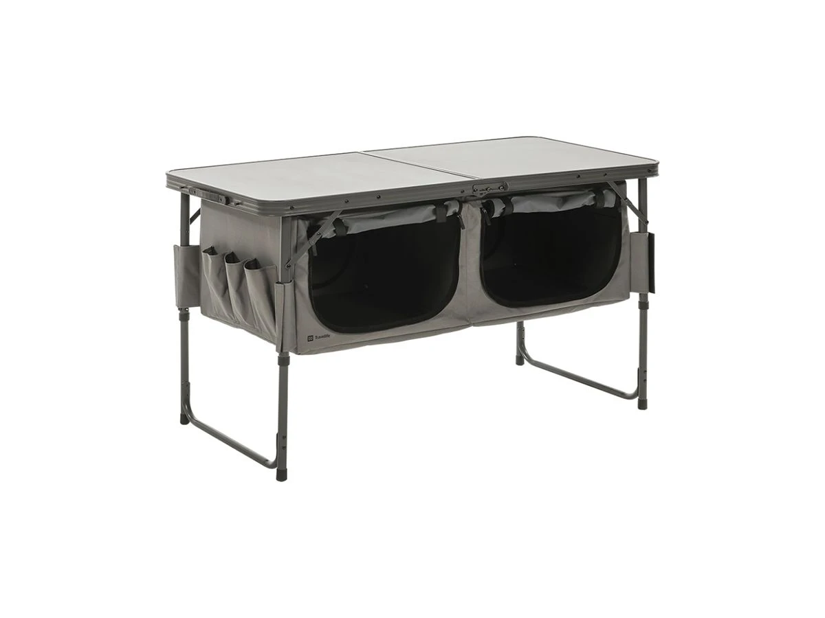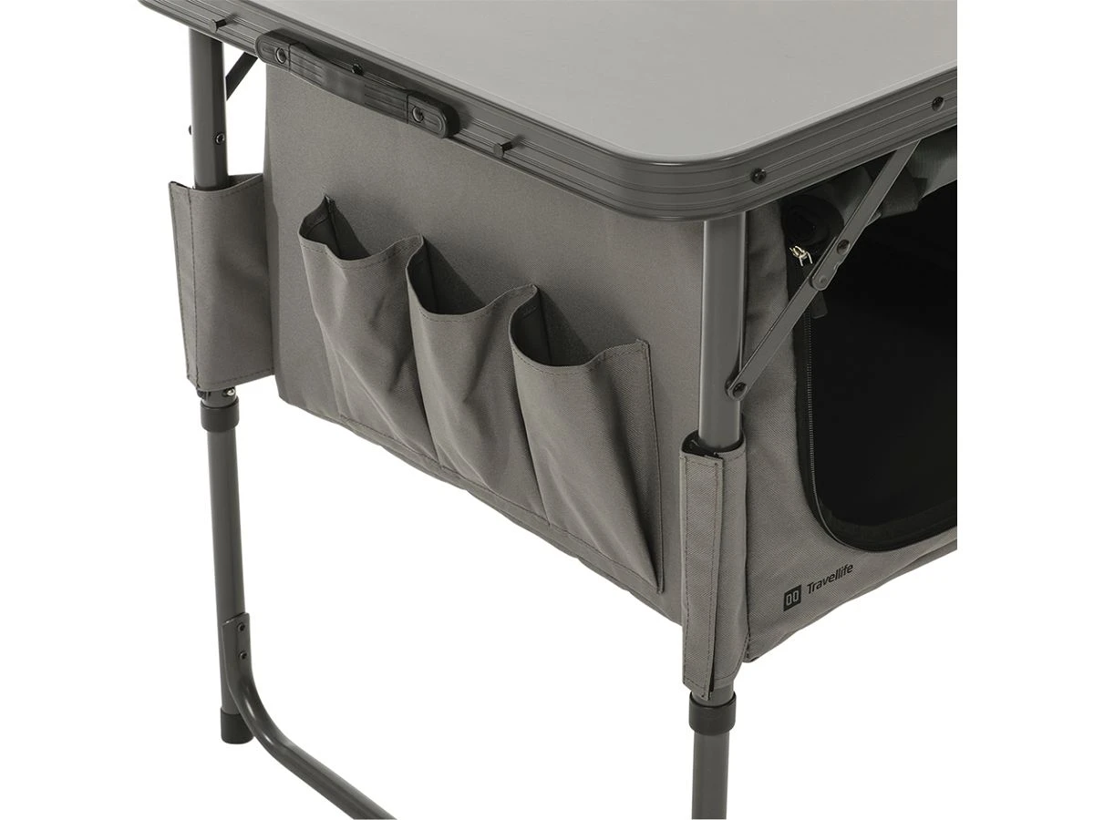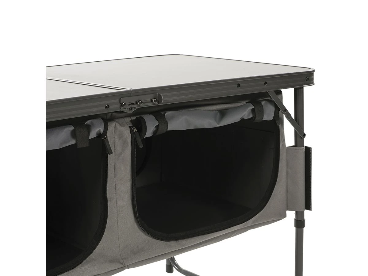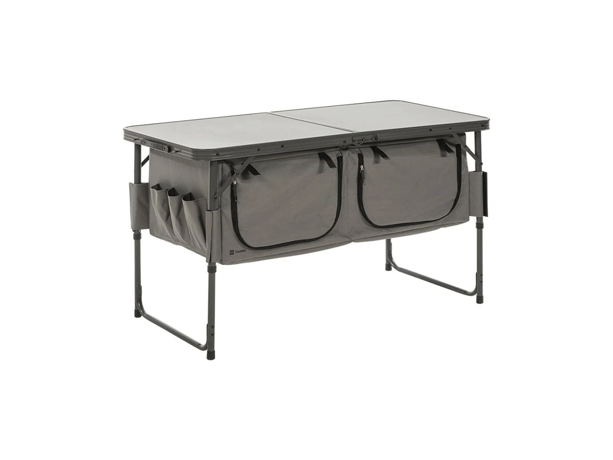 De brede Toledo opbergkast is donkergrijs van kleur en eenvoudig in te klappen. Dankzij de geïntegreerde draaghendel til je de tafel makkelijk op. De stof is water- en uv-bestendig, waardoor je hem zelfs in de buitenlucht kunt plaatsen. Bovendien beschikt de opbergkast over een rits waarmee de verschillende opbergruimtes volledig dichtgemaakt kunnen worden. Is er wat vuil op de stof gekomen? Geen probleem, dit reinig je eenvoudig met wat water en een doek.